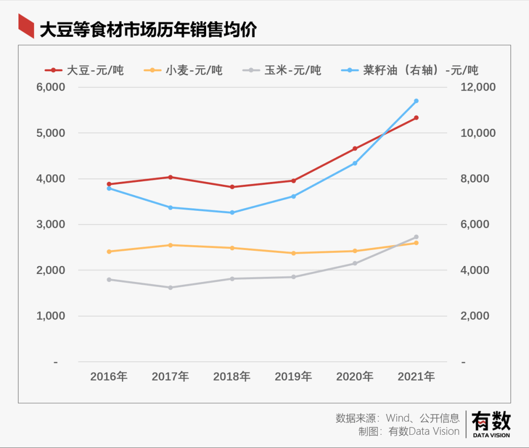 而具体到大豆、玉米这类餐饮调味品的重要原材料,价格的普涨同样与疫情的蔓延息息相关,玉米以及菜籽油涨幅均超过50%。