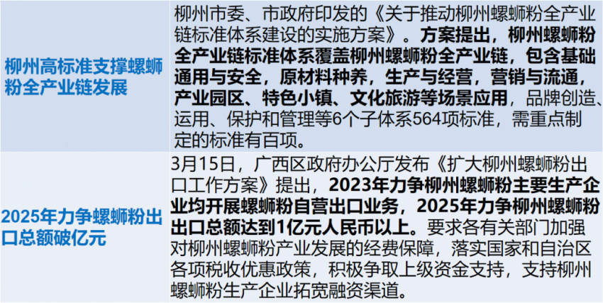 3月15日,自治区政府办公厅发布《扩大柳州螺蛳粉出口工作方案》明确提出,2022年力争螺蛳粉出口关税税则号申请工作实现突破,2023年力争柳州螺蛳粉主要生产企业均开展螺蛳粉自营出口业务,2025年力争柳州螺蛳粉出口总额达到1亿元人民币以上。方案要求自治区各有关部门和柳州市人民政府加强对柳州螺蛳粉产业发展的经费保障,落实国家和自治区各项税收优惠政策,积极争取上级资金支持,支持柳州螺蛳粉生产企业拓宽融资渠道。