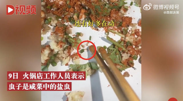 9日,火锅店工作人员表示,虫子是咸菜中出现的盐虫,他们发现后将咸菜都倒了。“天气热了(小料)也是刚倒进去的,然后可能过了2个小时,中间产生的热度就导致有盐虫。然后刚好又遇见停电了,监控也没有。他就这碗里的有(盐虫),其他的都没有,但是我们还是扔了,现在都没有用那个小料了。”