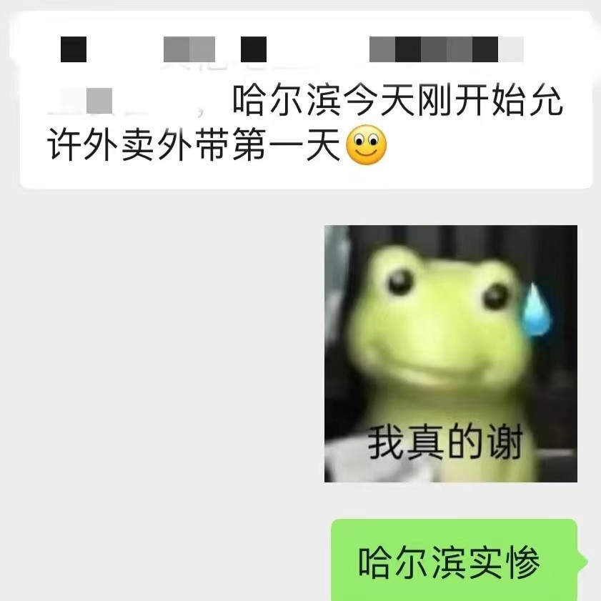 “哈尔滨,今天刚开始允许外卖外带。”