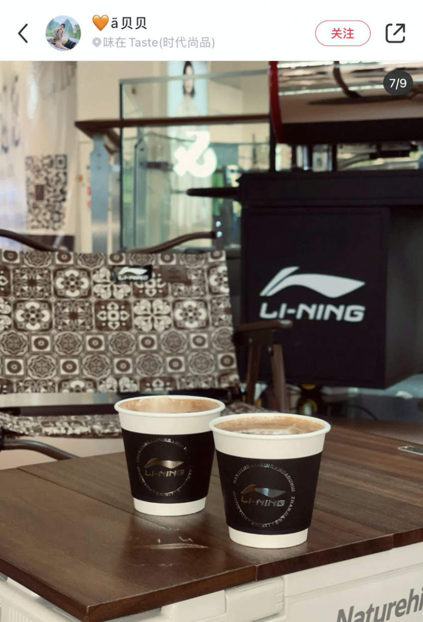 透过一位小红书博主的打卡帖子,我们看到了宁咖啡的庐山真面目。今年2月初,她在广东湛江市一家新开的李宁专卖店门口,看到了标有“LI-NING”标识的咖啡小推车,车篷上印有李宁品牌logo和“X CAFE”的字样。帖子中她提到,在李宁门店任意消费都可以免费喝一杯李宁咖啡,杯子的logo也是常见的李宁品牌样式,很有氛围感。