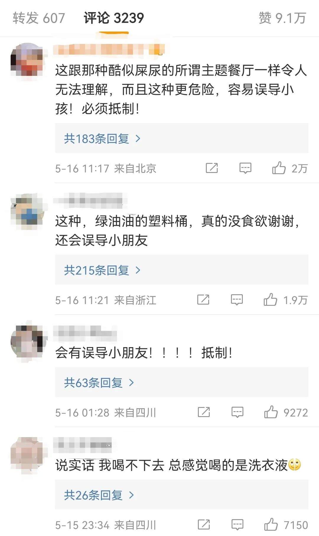 2、网友:“恐会误导小孩子,将家中的洗衣液当成奶茶喝”!