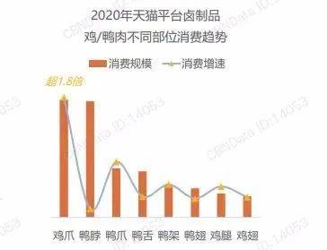 这几年,凤爪的消费还超过了鸭脖。根据天猫发布的天猫平台卤制品鸡/鸭不同部位消费趋势,2020年凤爪消费增长超1.8倍,消费规模位居第一,其后才是鸭脖、鸭爪、鸭舌等大热品类。
