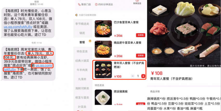 不少商家则是通过自有小程序,做自己的“外卖”,优点是可以靠短信等形式自主推广,而且可以做零售。每餐都要点外卖的用户陈宇称,自己在5月收到了多个商家的推销短信,点开链接直接进入商家的小程序。他曾这样点过一份火锅外卖。