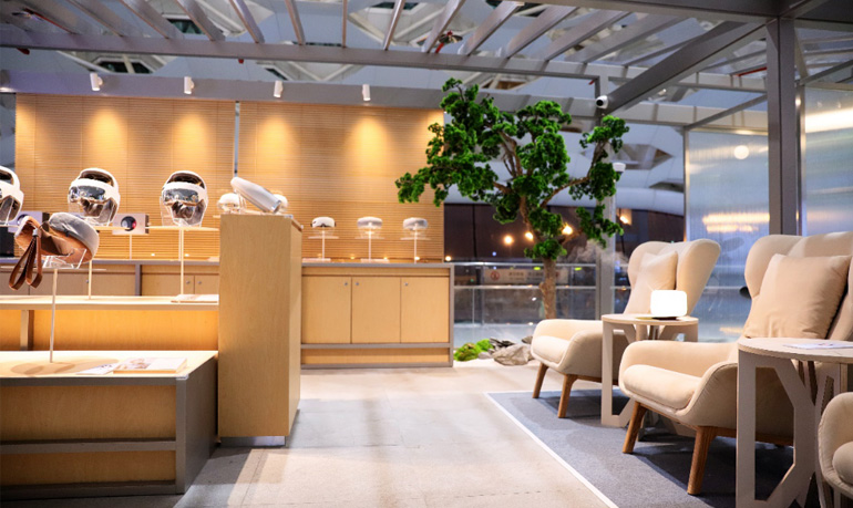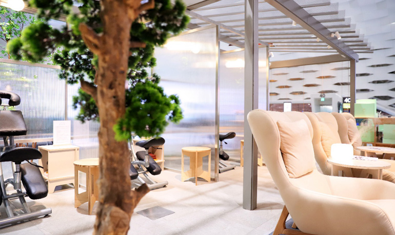 “旅途匆匆,请放轻松”。走进轻松茶舍天然木质空间,仿佛刚从钢筋混凝土逃离,觅得一处桃花源,除了体验倍轻松最新的科技产品,也可以啜饮以“草本”“东方”“当代”为核心概念特别调制的元气茶饮,享受草药包热敷以及植物愈合调性的香氛产品,将古老东方调养与平衡的智慧更好融入现代生活,确保您时刻处于最佳状态。