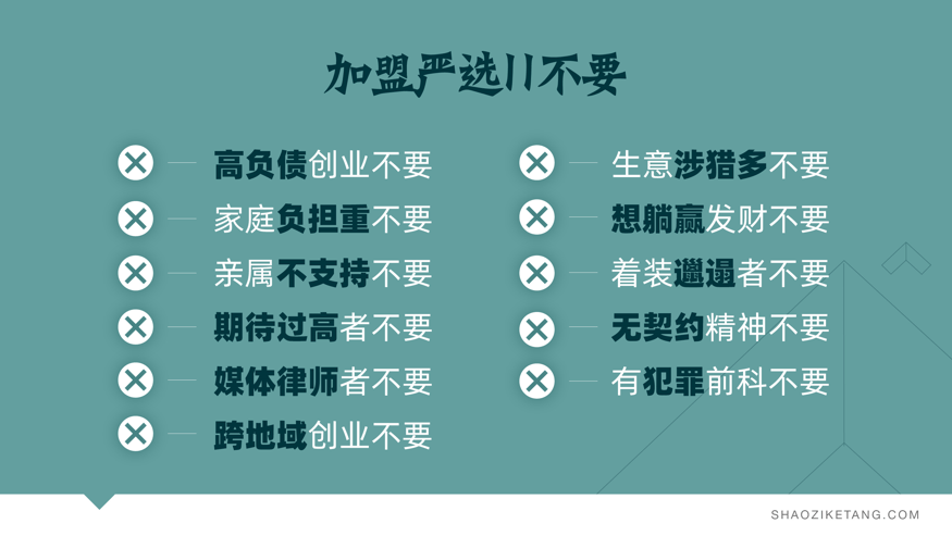 简单而言可以归结为11不要:高负债不要、家庭负担重不要、亲属不支持不要、期待过高不要、媒体律师不要、跨地域创业不要、生意涉猎过多不要、想躺赢发财不要、着装邋遢不要、有违约记录不要、有犯罪前科不要。