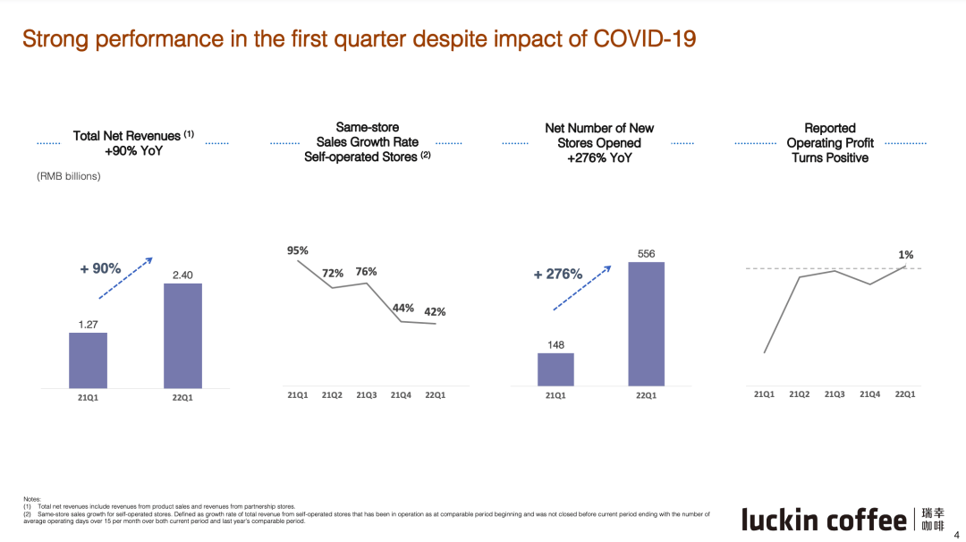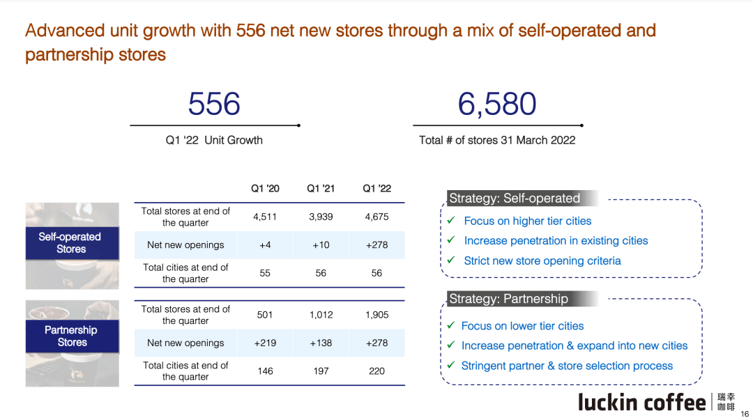 除了净收入和营业利润大幅提升外,财报显示,第一季度,瑞幸净新开店数为556家,与截至2021年第四季度末的门店数量相比,门店数量环比增长9.2%。截至2022年3月31日,瑞幸门店总数达到6580家,包括4675家自营门店和1905家联营门店。