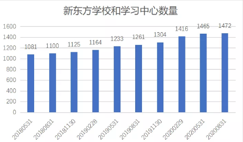 截至2020年8月31日,新东方线下学校总数为112家;学习中心总数1472家,与去年同期相比净增211家(2020财年同期学习中心总数为1261家),与上季度相比净增7家(2020财年第四季度学习中心总数为1465家)。同时,新东方进入了七个新城市,教室面积同比增加约23%,环比增加1%。