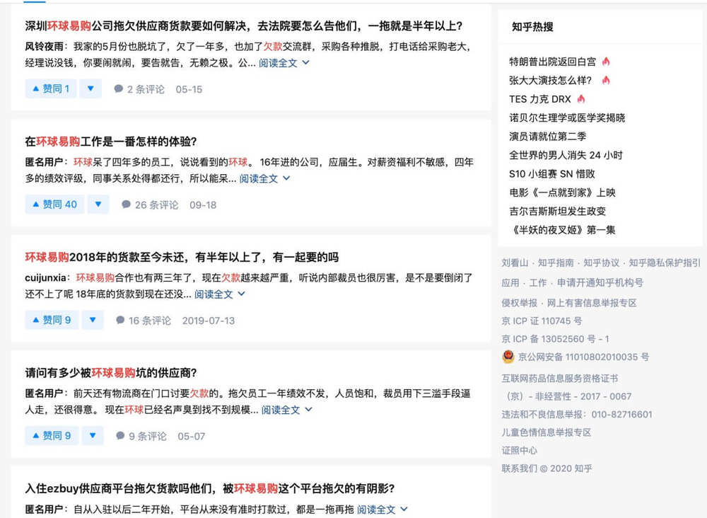 知乎上的关于环球易购的讨债帖子