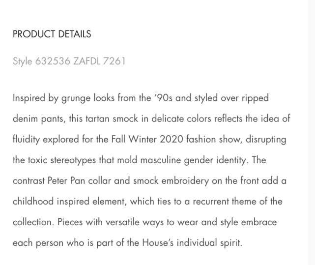 这款格子呢工作服以90年代的摇滚风为灵感,并以破烂的牛仔长裤设计风格、精致的色彩,反映了GUCCI 2020年秋冬时装秀所探索的流畅感。彼得潘衣领和罩衫式刺绣增加了童年时代的元素,打破了塑造男性性别认同的有害刻板印象... ...