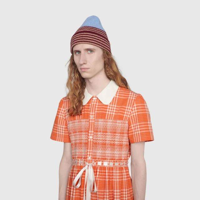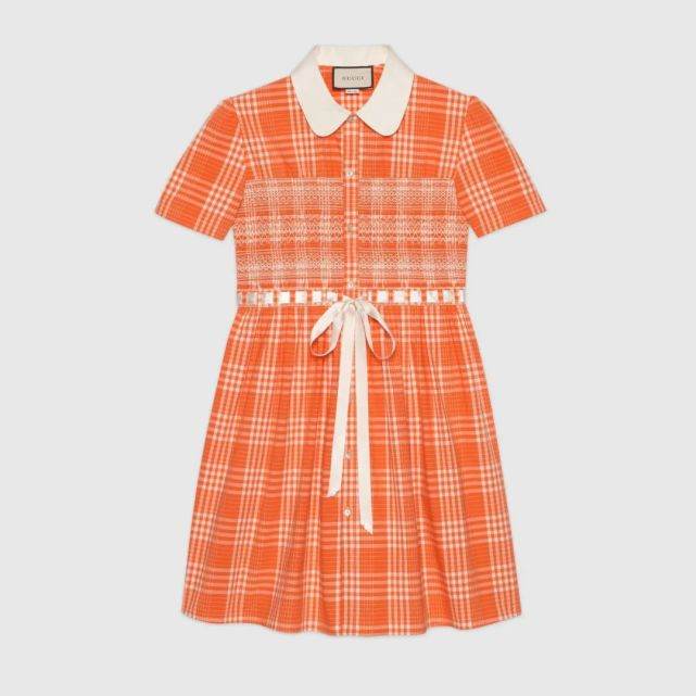 这条裙子的设计亮点从俏皮的娃娃领开始,一直到腰间缎面的蝴蝶结掀起高潮,细节上还使用了珍珠母纽扣推波助澜,搭配明艳的橘黄色调与格子纹,十分抢眼。更重要的是,这是一条专门为男士设计的连衣裙。