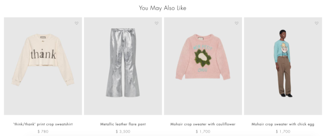 进一步来看,在GUCCI官网这款“连衣裙”产品的售卖页面,还会推荐阅览的男性消费者其它几件产品,其中包含高腰的短袖,走秀风的金属光泽喇叭裤,粉嫩或者露脐的男士毛衫。