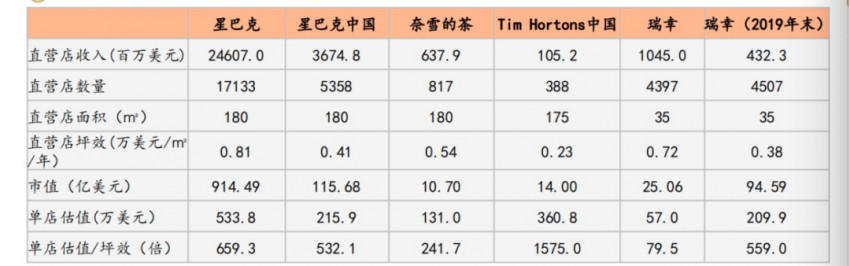 平安证券曾选取同为现制饮品赛道中的咖啡和茶饮行业可比公司进行对比,以瑞幸直营店为参照,据平安证券测算,瑞幸直营店年坪效达0.72万美元/㎡,仅低于星巴克全球,但其单店估值仅为57万美元,处于现制饮品行业的最低水平。