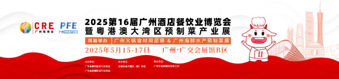 粤港澳大湾区餐饮食材行业风向标——CRE广州餐博会专注于开拓华南地区的餐饮市场,用低成本探索产品,寻找新机遇,为餐饮行业发展华南地区商贸合作提供一个分销、采购的专业化平台。CRE·2025第16届广州酒店餐饮业博览会暨粤港澳大湾区预制菜产业展(简称:CRE广州餐博会),同期举办:2025第16届中国(广州)火锅食材用品展、广州海鲜水产预制菜展,将于2025年5月15-17日相聚广州·广交会展馆B区!邀请全球优质企业,携全球优选品牌再聚美食之都——羊城广州。