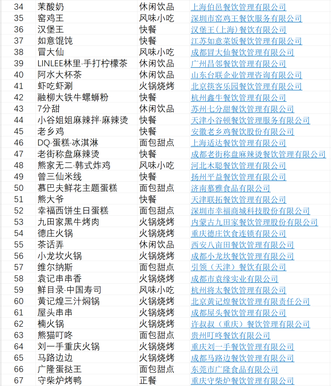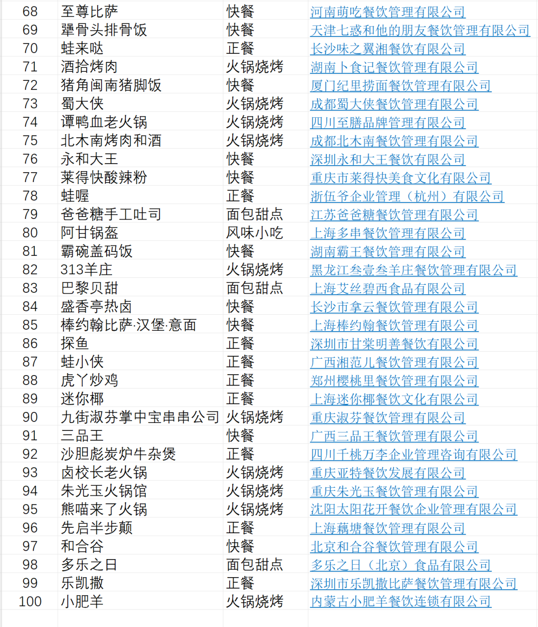 2024中国餐饮加盟品牌TOP100入围品牌公示