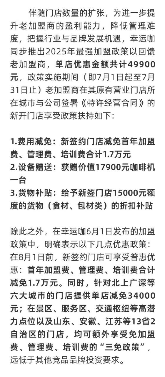 为了鼓励老加盟商继续拓展业务,幸运咖特别推出了一项优惠加盟政策。根据政策,在7月1日至7月31日期间,老加盟商新开单店可享受共计49900元的优惠金额。这一举措有效降低了开店成本,为更多潜在投资者提供了机会,同时也展现了幸运咖对合作伙伴的支持。