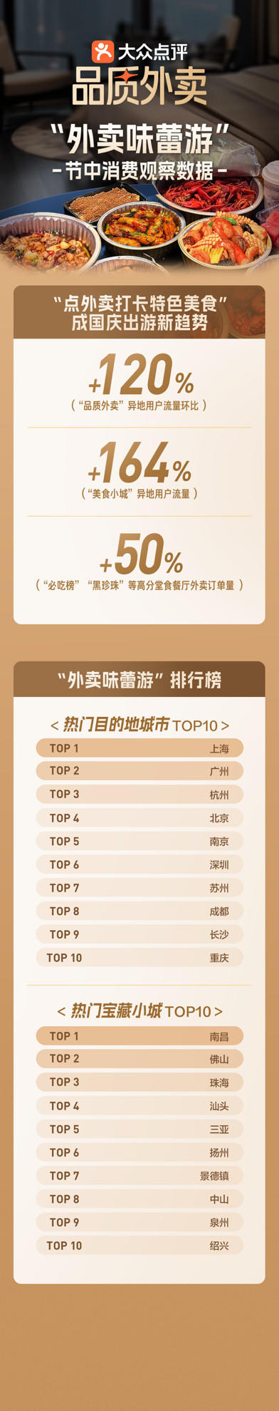长假已过半!游客从“排队吃”到“外卖吃”,大众点评“品质外卖”美食小城异地用户流量增164%