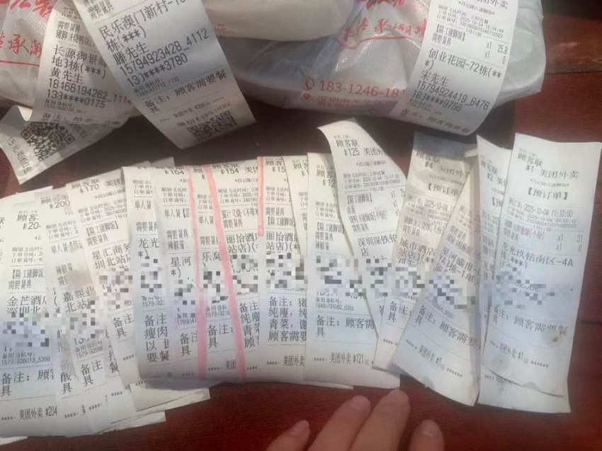▲ 昌记隆江猪脚饭的黄老板向记者展示大量地址为附近酒店的外卖单。(图源:商户供图)