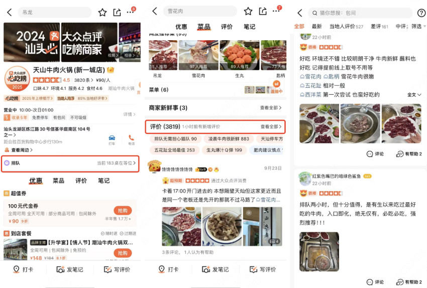 其评价区有大量显示几小时前新增的“吃货实时测评”,“晚饭排队3小时,可以提前点评拿号,肉好新鲜、大片厚切”“排队俩小时,但非常值得”“牛肉鲜美嫩滑,清汤锅底清甜,绝配”........率先尝鲜的食客,正用寥寥几字在社交平台上勾勒出朴实又真实的感受,吸引着更多在路上的游客前往打卡。