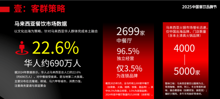 除了品牌文化出海以及充分满足当地消费者需求,朱光玉在马来西亚开店,还采取了客群策略。具体而言,在马来西亚华人占马来西亚总人口的22.6%,对中餐接受度高。相关数据显示,截至2025年5月,全马来西亚约有2699家中餐厅,其中96.5%为独立经营,3.5%为连锁品牌。