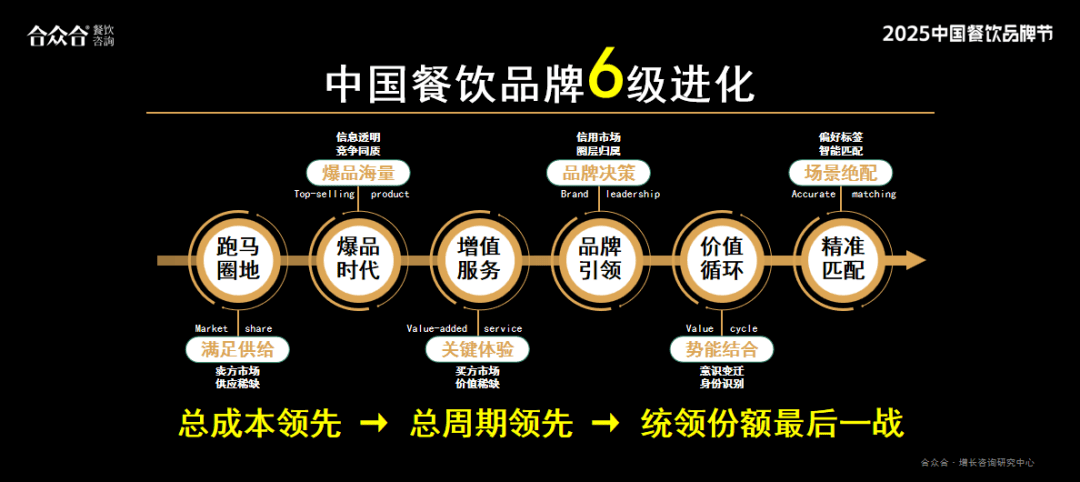 最后我总结一下,中国餐饮品牌6级进化:跑马圈地、爆品时代、增值服务、品牌引领、价值循环、精准匹配,它是一个综合的线。对于今天的企业来讲,每一步都要做得比较夯实。