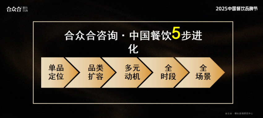 我们再看中国餐饮的5步进化,从单品定位到品类扩容到多元动机到全时段到全场景。