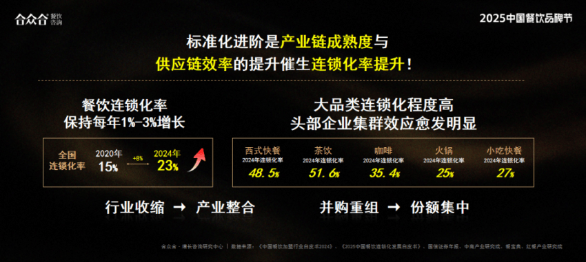 并不是说中餐不能规模化。真正的标准化进阶,取决于产业链的成熟度与供应链的效率。据公开数据,餐饮连锁化率正在不断提升:西式快餐已达48.5%,茶饮更是达到51.6%。