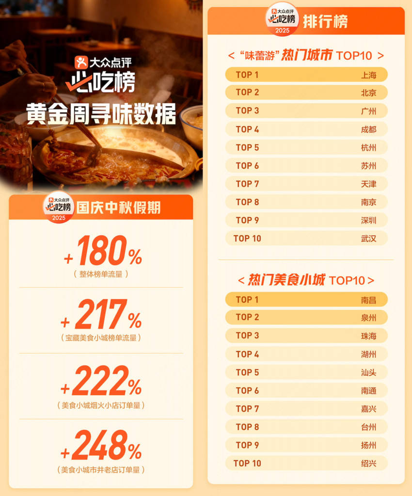 大众点评“必吃榜”发布黄金周寻味数据,美食小城烟火小店订单量涨超222%