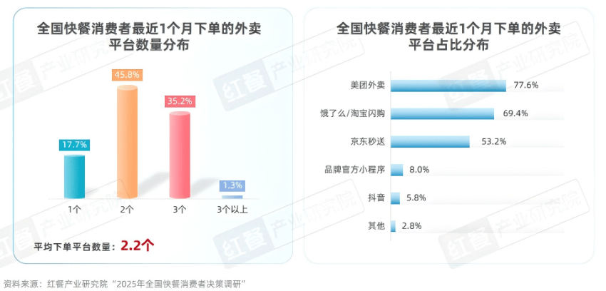 实际上,在线上外卖消费场景中,消费者对平台的忠诚度普遍较低,多数消费者倾向于通过多平台对比信息(如商家、菜品、价格、配送费及配送时效等)来优化选择,其中价格是核心关注点。红餐产业研究院“2025年全国快餐消费者决策调研”显示,91.3%的快餐消费者在点外卖时出现了“多平台跳转”行为;82.3%的快餐消费者最近1个月在两个及以上外卖平台上下单了外卖。