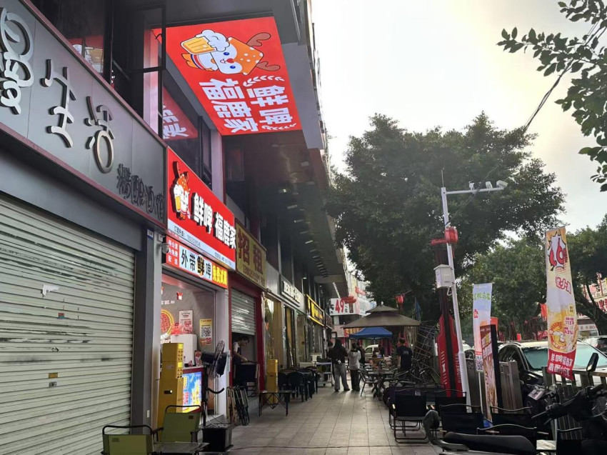 该店面积约20多平米,主打档口自提及外卖,布局与奶茶店相似,前台设有餐牌、收银机和封口机,店内配备了两套露营桌椅。