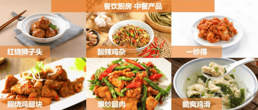 面向西式餐饮客户的产品包括鸡米花、咔滋香脆鸡、鸡肉洋葱圈、黄金烤翅等;针对中式餐饮则推出照烧鸡腿块、酸辣鸡杂等特色菜品……
