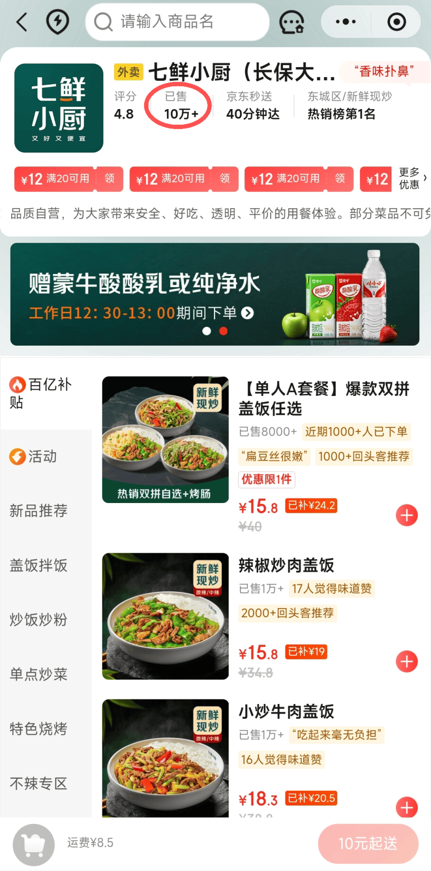 今年7月,京东推出“七鲜小厨”,计划三年内布局1万家门店,主打现炒现做。截至10月29日,其首店(长保大厦店)在京东外卖平台累计销量突破10万单,饿了么和美团月销量分别为900+和300+单。