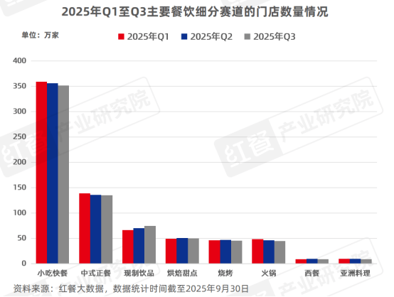 门店数量方面,各细分赛道表现分化。红餐大数据显示,截至2025年第三季度末,小吃快餐、中式正餐、现制饮品三大赛道门店数位居前三,其后依次为烘焙甜品、烧烤、火锅、西餐及亚洲料理。