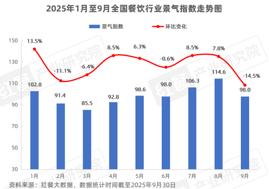 红餐大数据显示,2025年第三季度全国餐饮行业景气指数在7月和8月显著上升,9月则回落至98.0,环比下降14.5%。