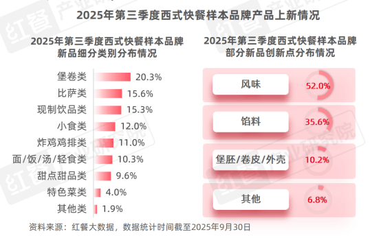 2025年第三季度,33个西式快餐品牌共推出301款新品,涵盖堡卷、比萨、现制饮品、小食等9大类。