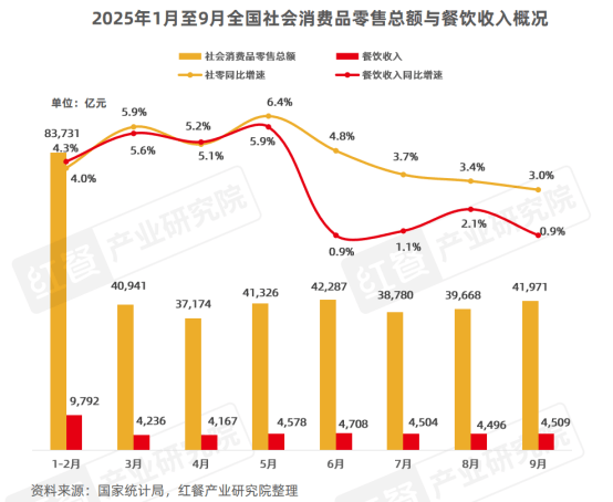 餐饮领域亦呈现类似趋势,餐饮收入增速出现波动。据国家统计局数据,2025年7月至9月,全国餐饮收入同比增速呈先升后降走势,9月同比增幅仅为0.9%。下文将从景气指数、门店数量及人均消费三个维度展开详细分析。