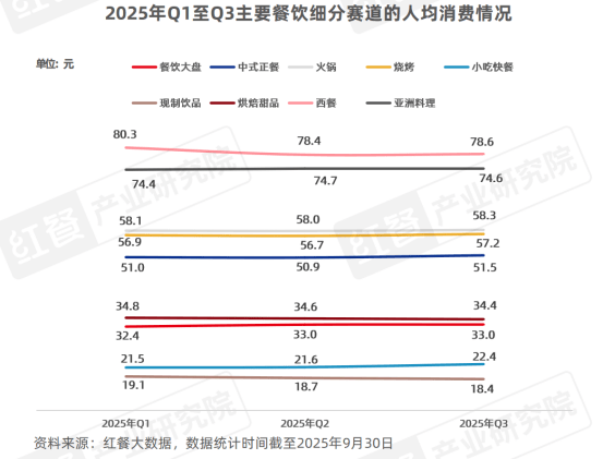 红餐大数据显示,2025年第三季度餐饮行业人均消费由一季度的32.4元小幅提升至33.0元。