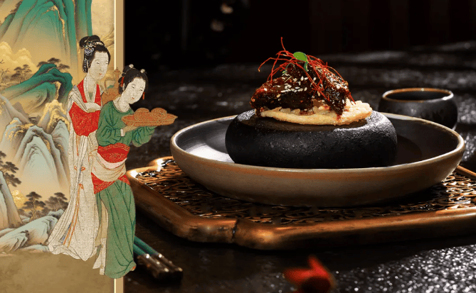 青岛的兰齐宴赋定价298元/位,场地与布景相应简化。菜品推出“大唐庵罗果奶”“东坡肉烧鲍鱼”等融合古典意象与地方风味的创新菜式;表演则融入“火牛阵”“胶东王”等与青岛历史紧密相关的典故,增强观众代入感。