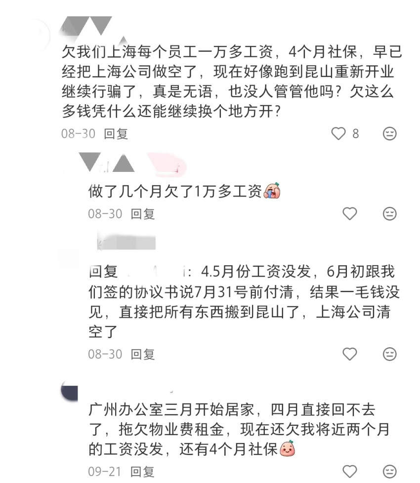 社交平台上,多名自称前员工的用户发帖控诉公司长期拖欠薪资与社保:“上海每位员工被欠薪一万多,还有四个月社保未缴,公司早就把上海团队掏空了”“广州办公室3月开始居家办公,4月直接进不去,物业费和租金都欠着,还欠我近两个月工资加四个月社保”“兼职工资拖了半年,上个月只收到几百块”……