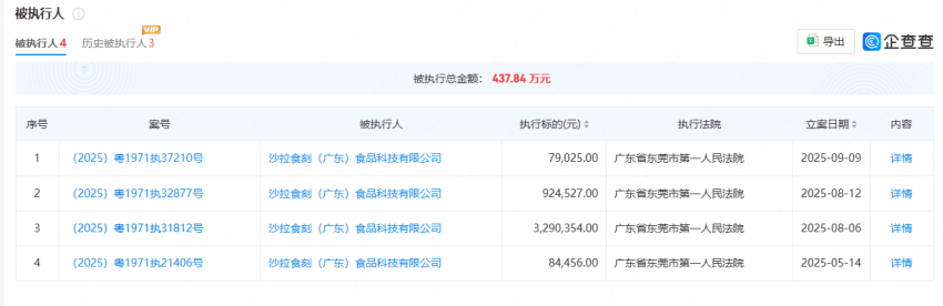 红餐网梳理发现,早在今年3月,沙拉食刻就被曝出资金链断裂,面临来自供应商、加盟商、员工及消费者的多重追债。企查查数据显示,其运营主体“沙拉食刻(广东)食品科技有限公司”作为被告的诉讼案件已达35起,被执行总金额高达437.84万元。