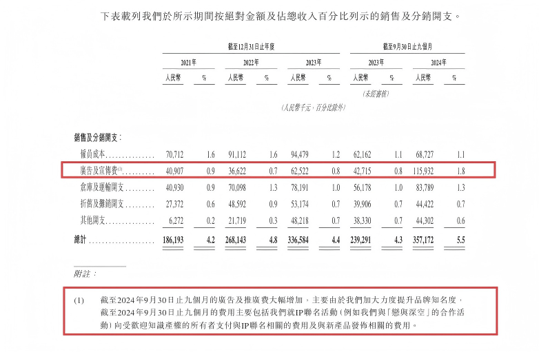 古茗在其招股书中披露,2024年广告及宣传费用同比激增超7000万元,并明确指出增长主因系IP联名活动,特别提及“与《恋与深空》的合作”作为典型案例。