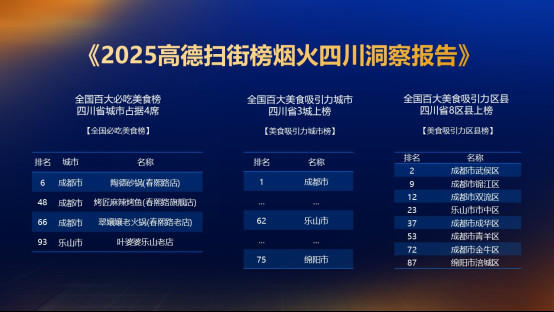 高德发布《烟火四川TOP100餐厅》榜单:21座城市中19城均有餐厅入选,展现全域美食活力。