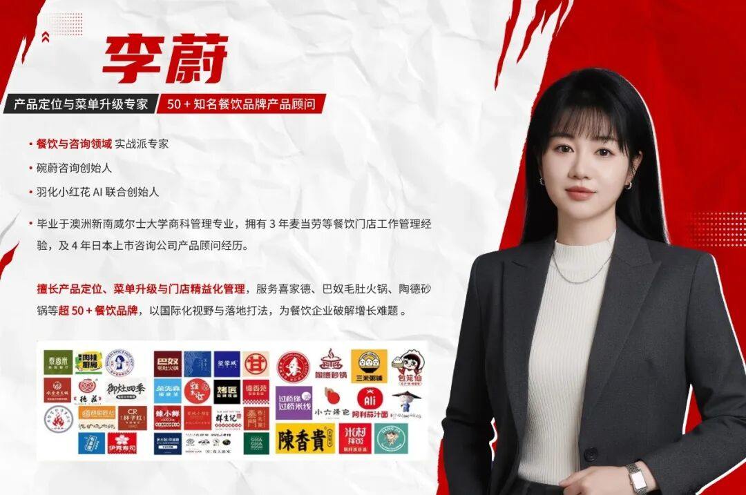 本期沙龙主讲人李蔚老师,深耕餐饮产品战略与菜单优化领域多年——拥有澳洲新南威尔士大学商科管理背景,曾任职麦当劳门店管理三年,并在日本船井商务咨询担任产品顾问四年,现任碗蔚咨询创始人、羽化小红花AI联合创始人。