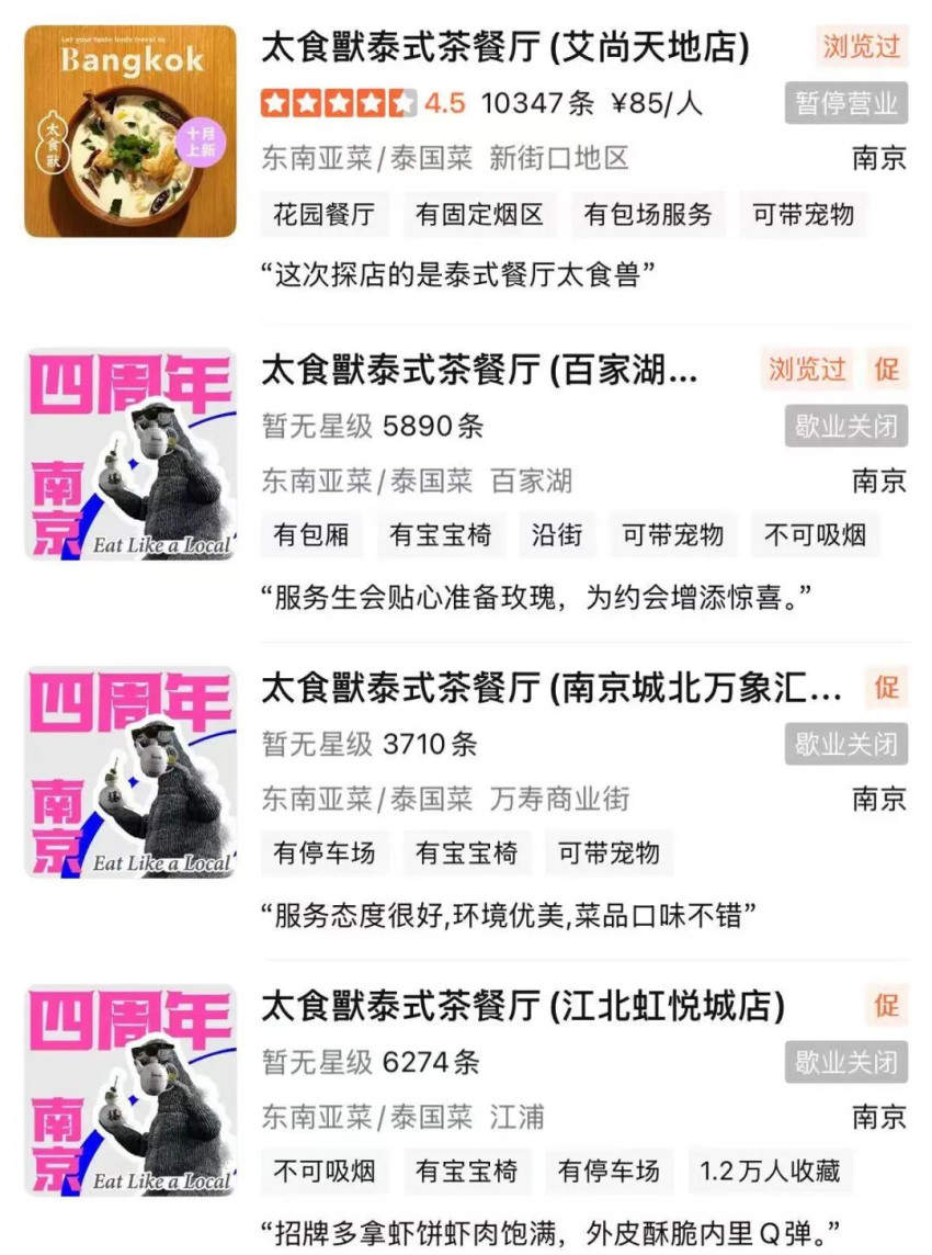 红餐网消息,主打地道泰餐的“太食兽”品牌近期在南京全面撤店,其位于艾尚天地、百家湖、城北万象汇及江北虹悦城的4家门店均已显示“歇业关闭”状态。