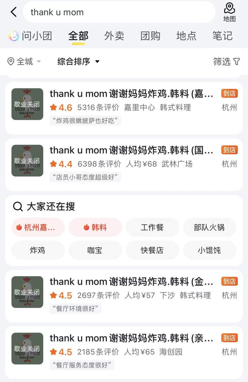 近日,有消费者在社交平台上发文表示,Thank u mom位于杭州嘉里中心的最后一家门店已经停止营业。“太突然了”“居然关门了”“真是时代的眼泪”“以后在杭州吃不到这家炸鸡了”……该门店关闭的消息迅速引发网友热议。
