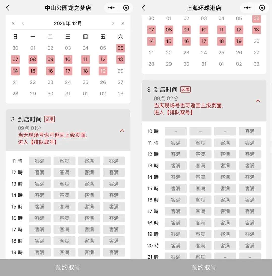 据寿司郎小程序显示,其位于上海的中山公园龙之梦店与环球港店将于12月6日同步开业,并于11月7日开放预约。截至11月20日,这两家门店在12月6日至19日期间的所有营业时段均已显示“客满”。