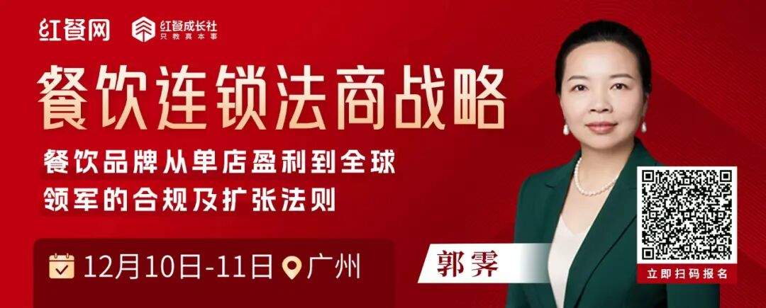 餐饮连锁的可持续增长,依靠的不是偶然机遇,而是前期扎实的合规布局。郭霁老师凝聚28年实战精华的合规扩张方法论,以及已被200+头部品牌验证的有效工具,将于12月10日-11日在广州集中呈现!