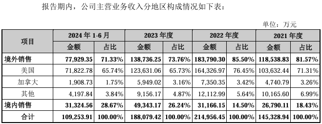美国始终是其核心市场。招股书显示,2021至2024年,美国市场收入占主营业务比重分别为71.31%、76.45%、65.73%和65.74%。2025年上半年,该比例为63.08%。