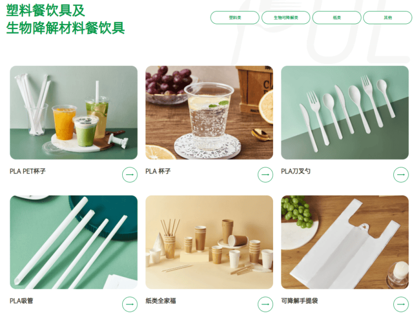 公司主营产品涵盖打包盒、水杯、吸管、餐盒、手提袋、刀叉勺等,材质包括传统塑料、PLA(聚乳酸可降解材料)及纸类等多种类型。