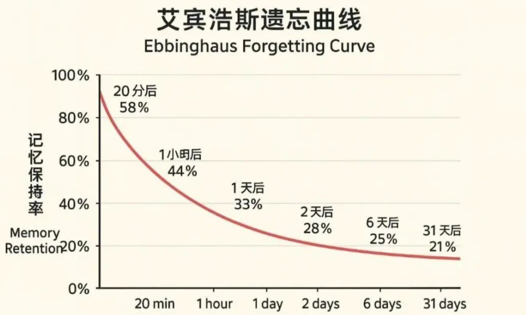 20分钟后,记忆保留率降至58%
